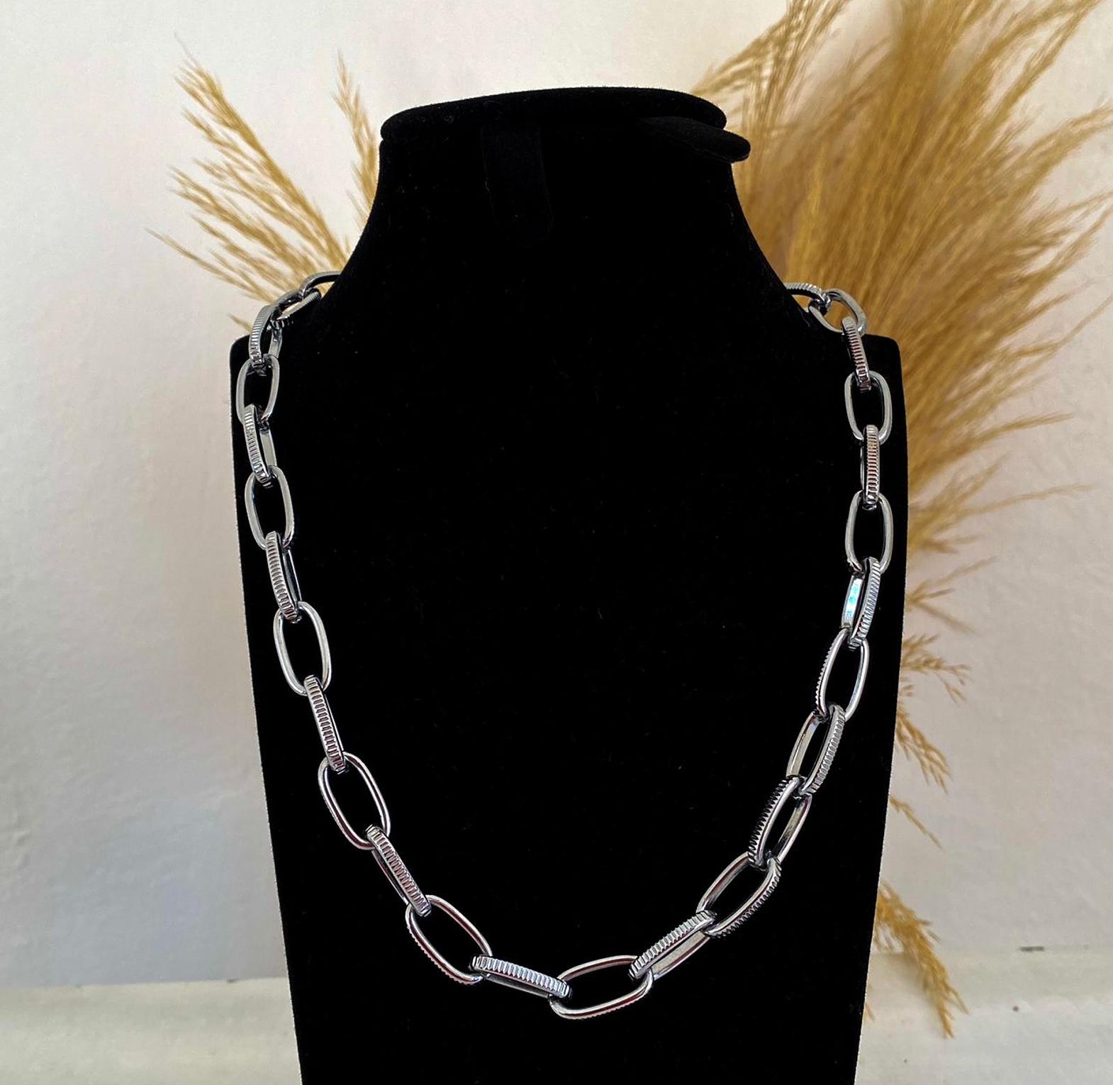 Make a bold and modern statement with this stylish chunky link chain. Its unique design features alternating smooth and ribbed links, adding a touch of sophisticated texture to your look.