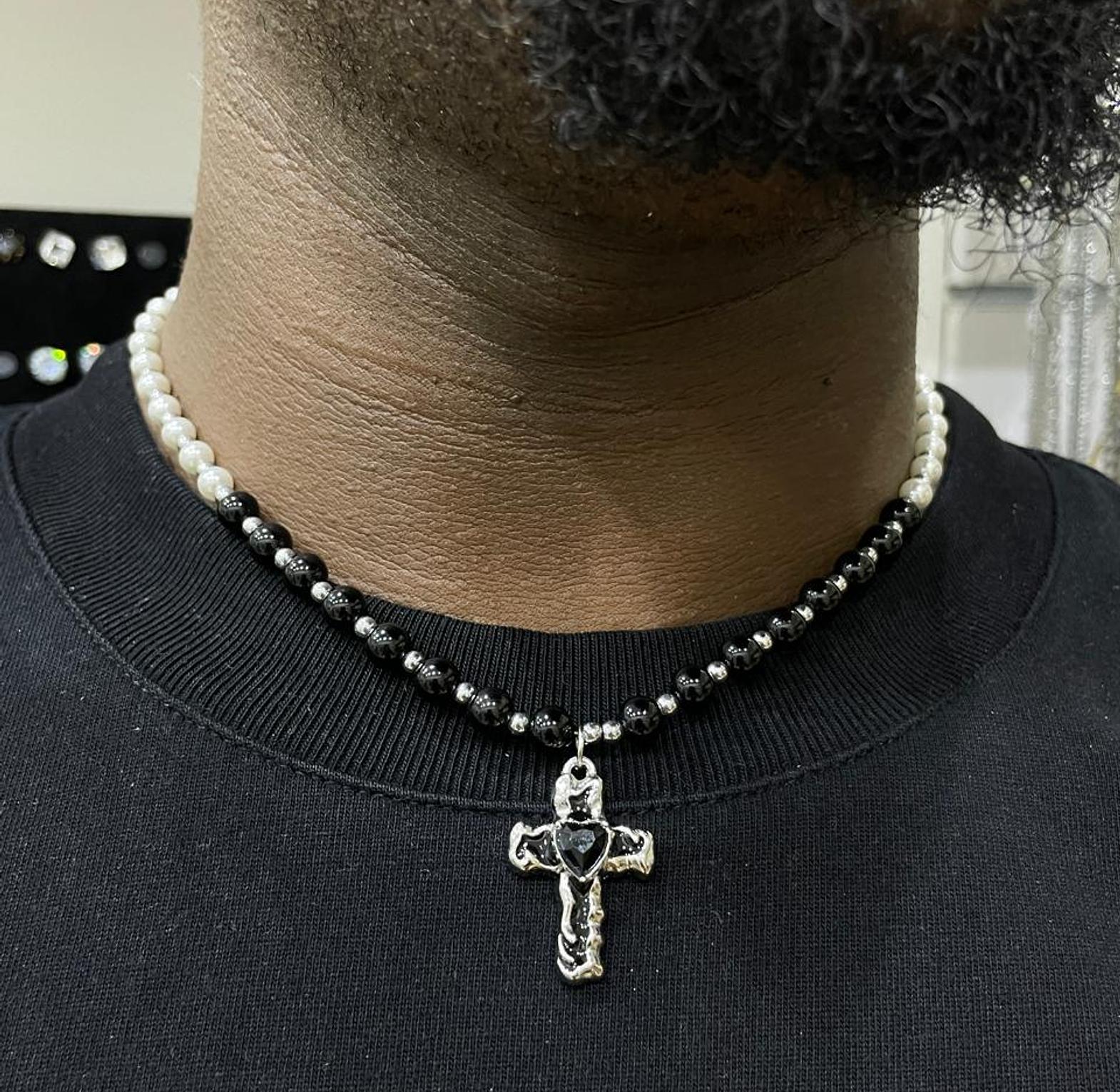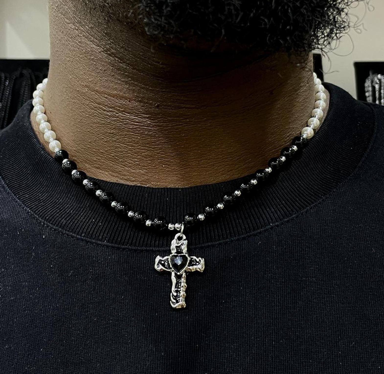 This Divine Grace Stainless Steel Cross Necklace combines spiritual symbolism with modern craftsmanship to create a meaningful accessory for daily wear. The centerpiece features a beautifully detailed stainless steel cross pendant with intricate engravings and a sleek polished finish that catches light beautifully. The necklace is strung with an alternating pattern of lustrous white pearls and sophisticated black beads, creating a striking contrast that enhances the pendant's visual impact. Crafted from high-quality stainless steel, this religious jewelry piece offers exceptional durability, tarnish resistance, and hypoallergenic properties, making it suitable for sensitive skin and everyday wear. The versatile design complements both casual and formal attire, while the secure clasp ensures comfortable all-day wearing. Whether worn as a personal statement of faith or given as a meaningful gift for baptisms, confirmations, or religious milestones, this cross necklace serves as a timeless reminder of spiritual devotion and divine protection.