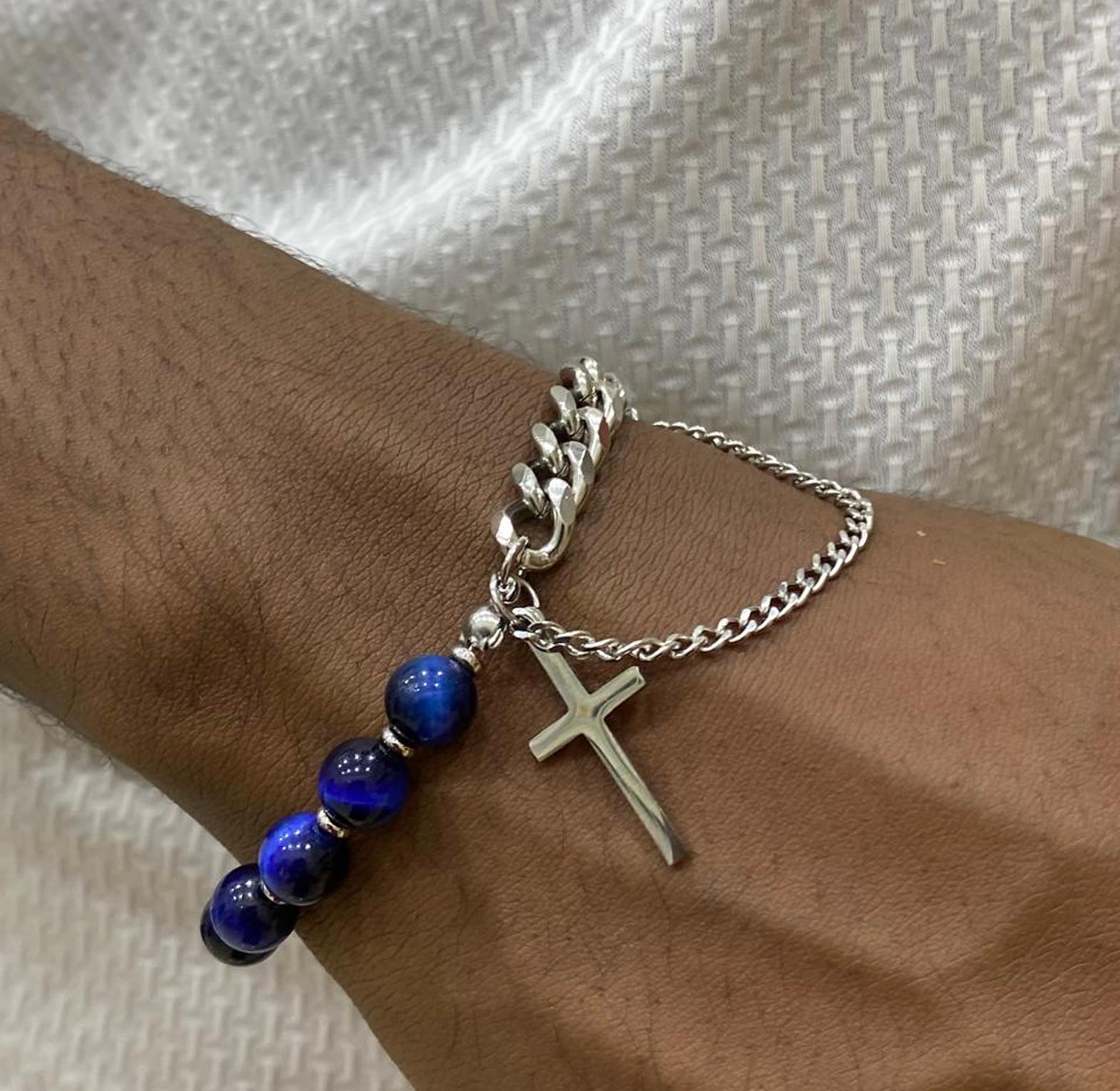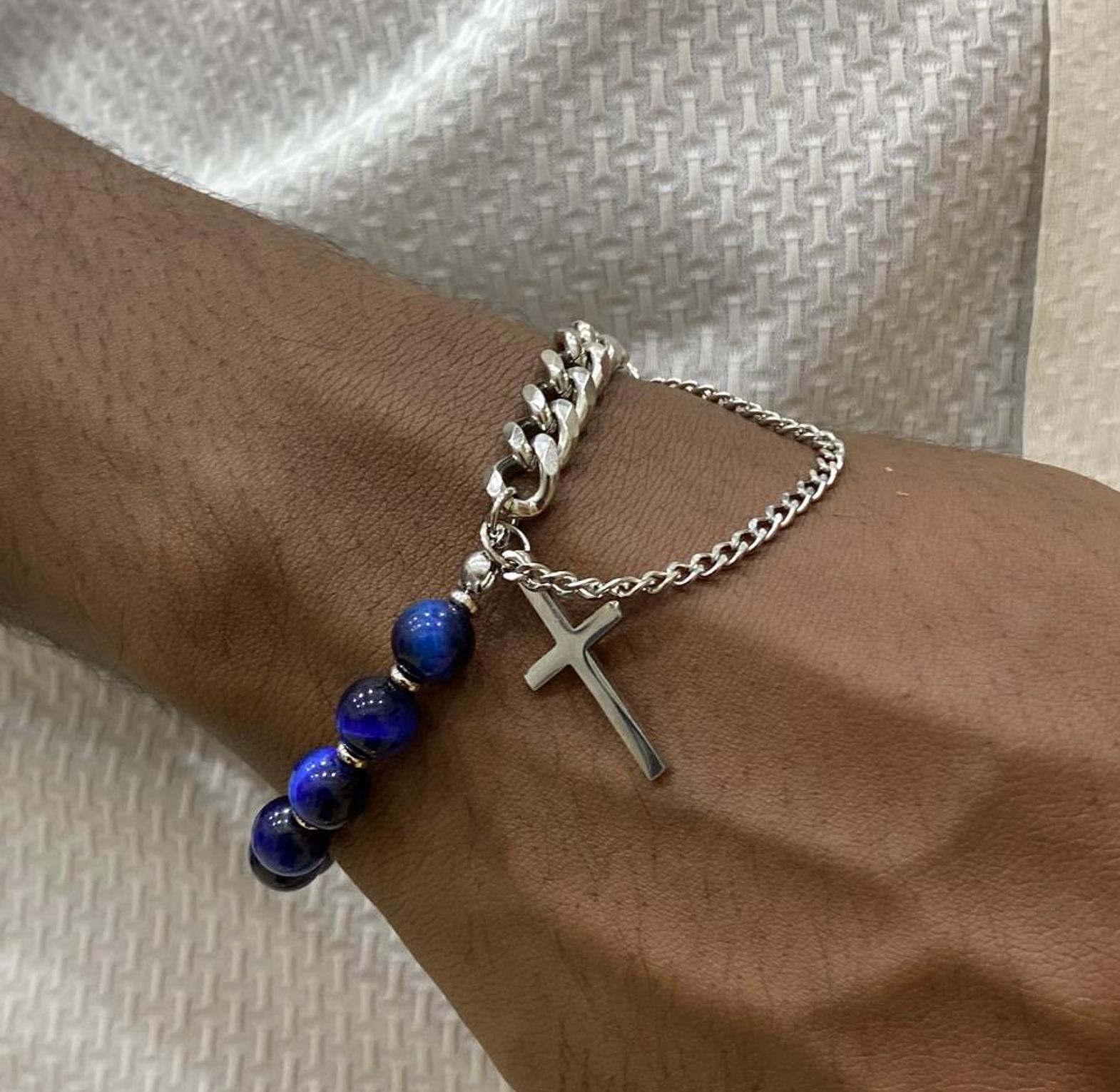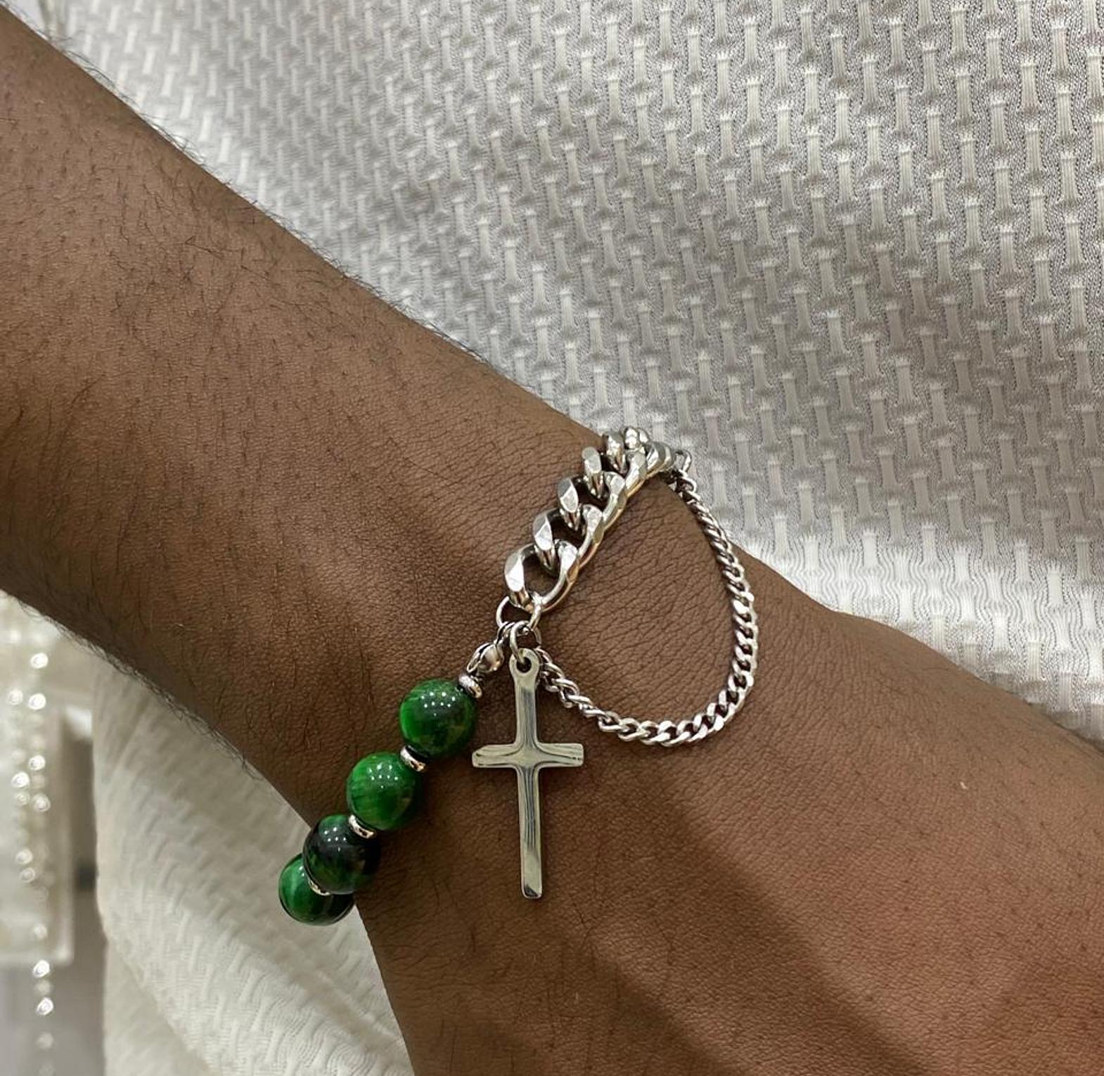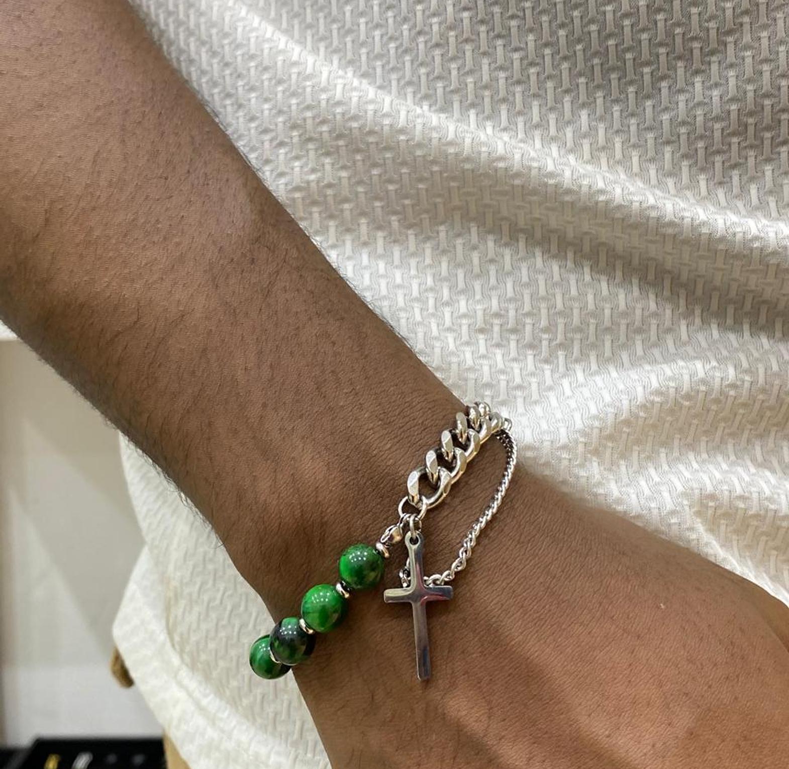 Express your spirit with the Faith & Form Bracelet, a dynamic accessory blending vibrant beads with a sleek chain and cross charm. Available in captivating blue or lush green, it adds a meaningful edge to your wrist.