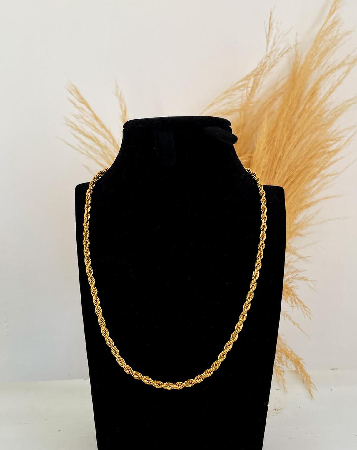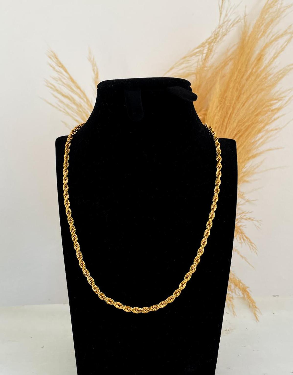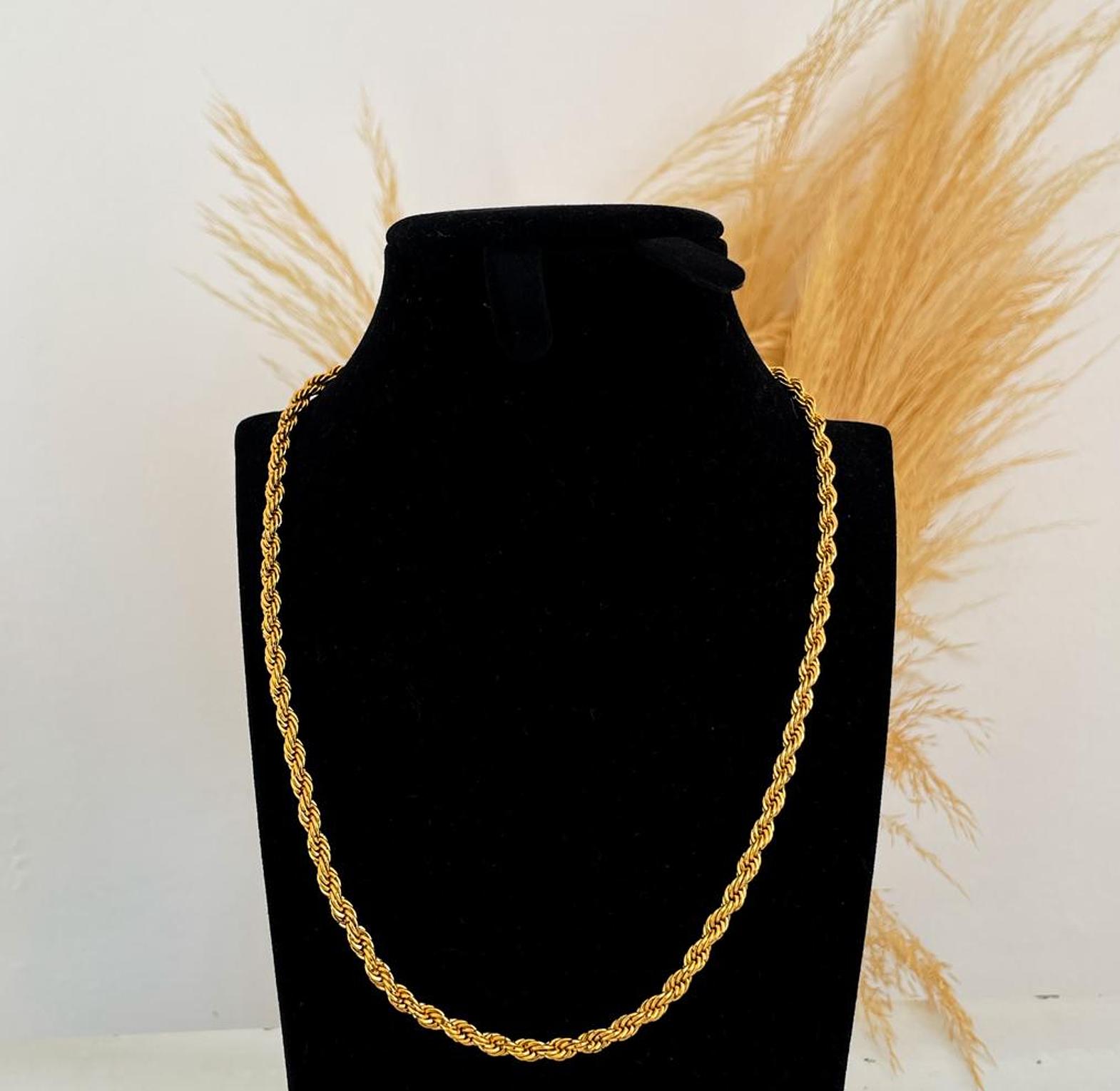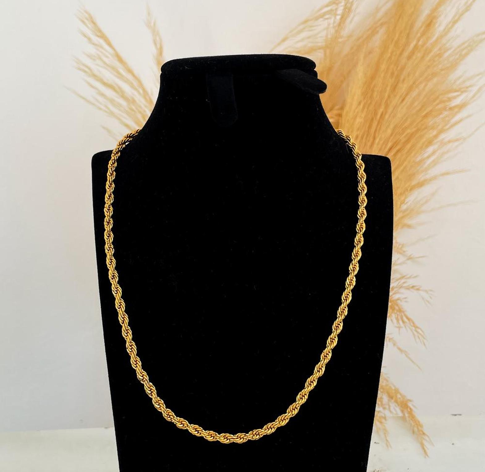 Timeless and versatile, this 5mm gold rope chain is a staple piece that adds a touch of bold elegance to any look. Its intricate twisted design offers a sophisticated texture and a brilliant shine.