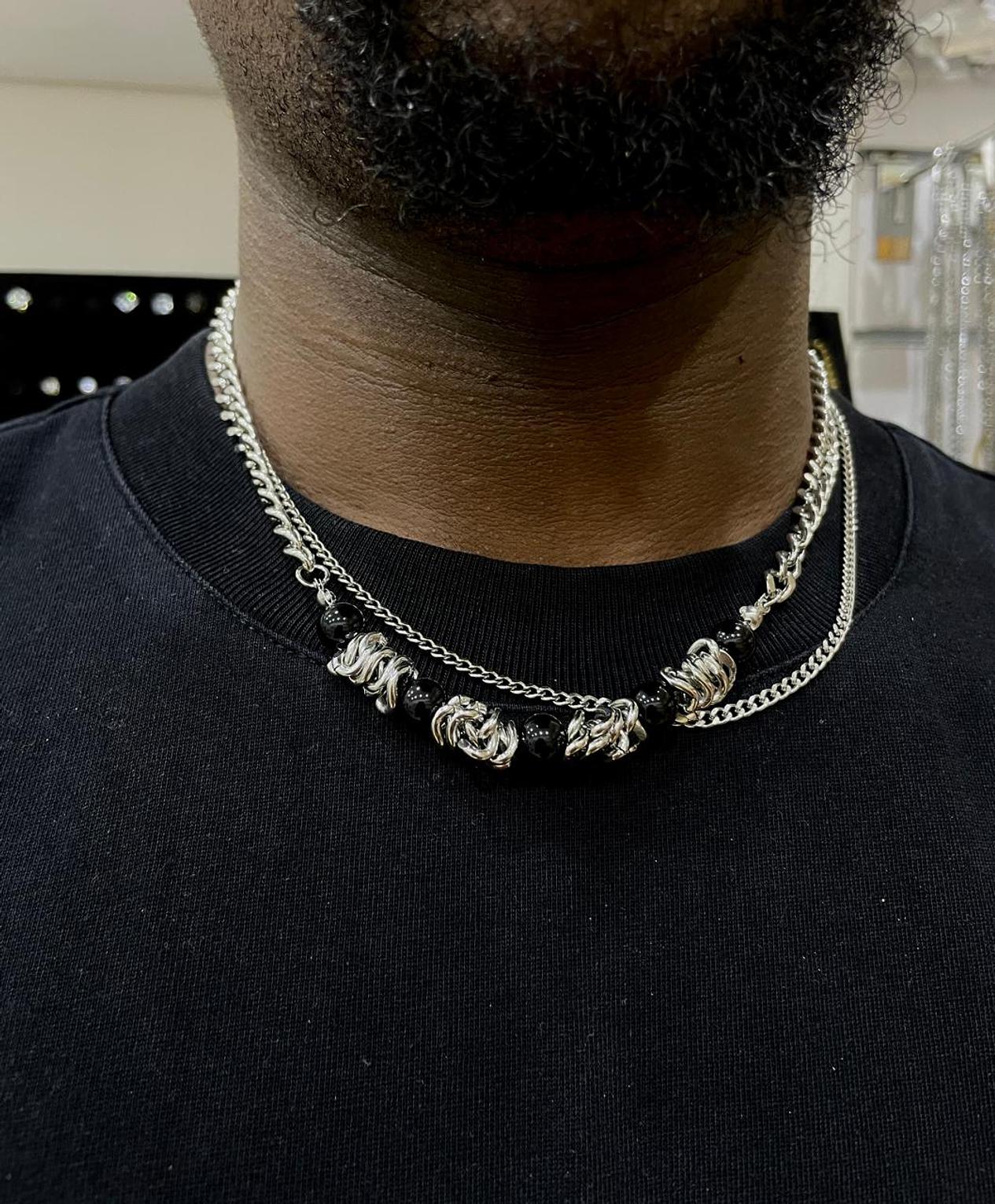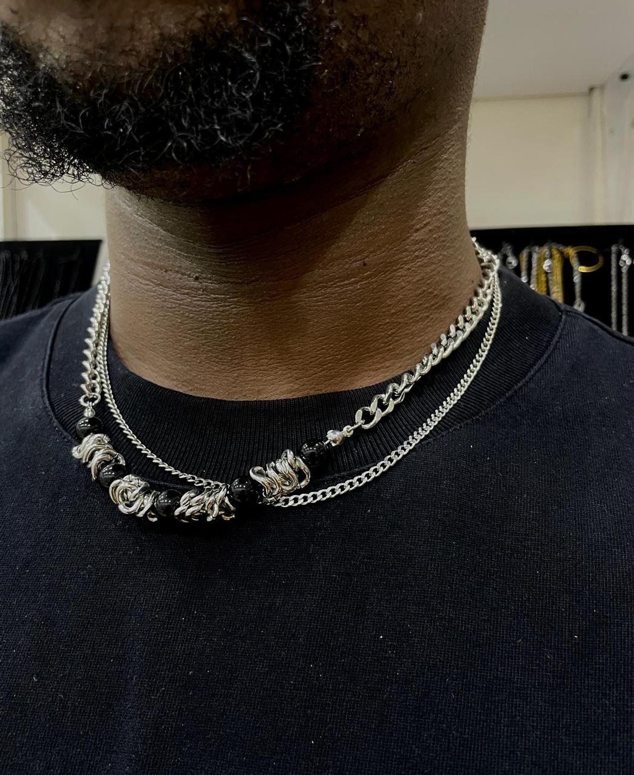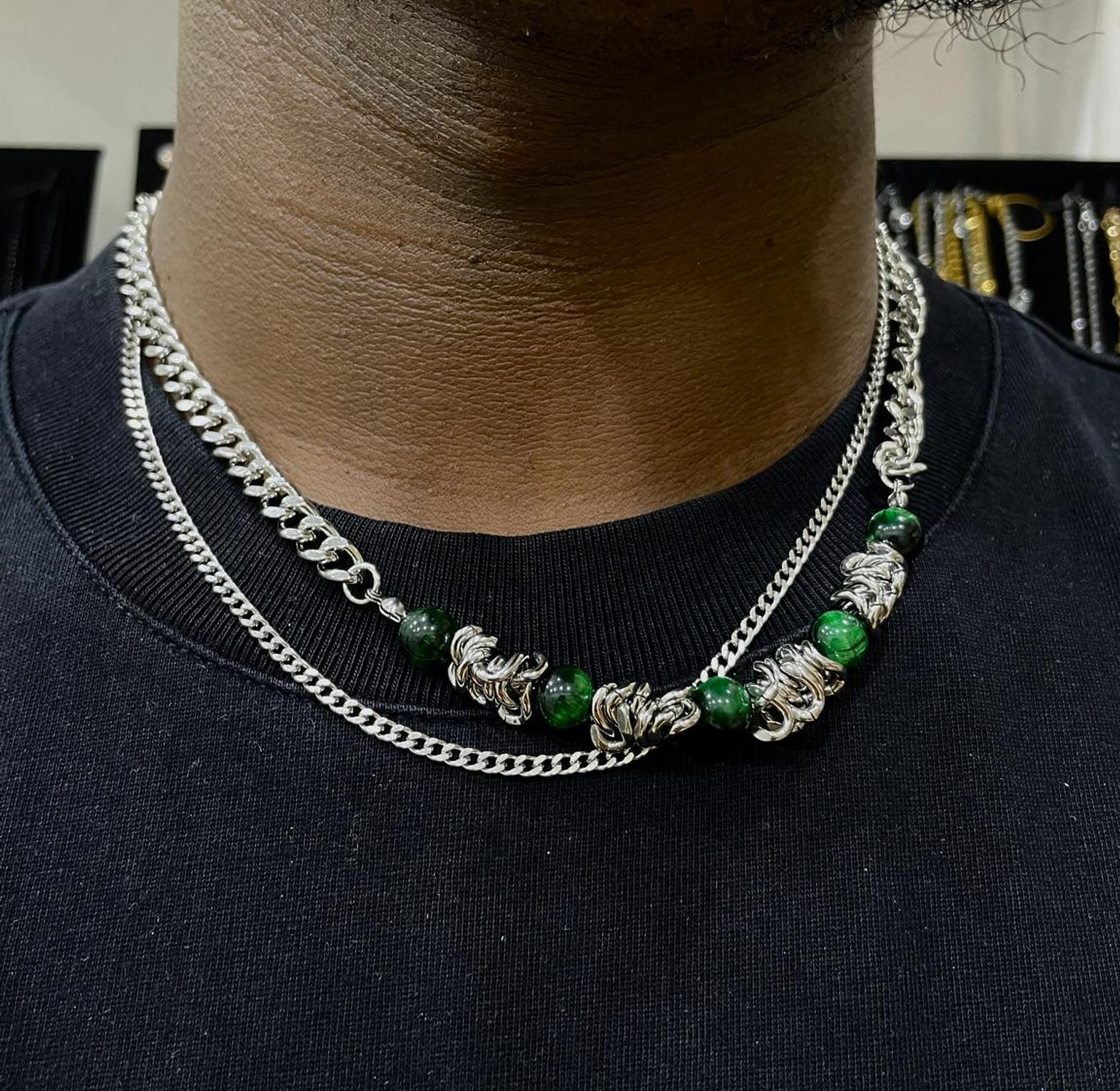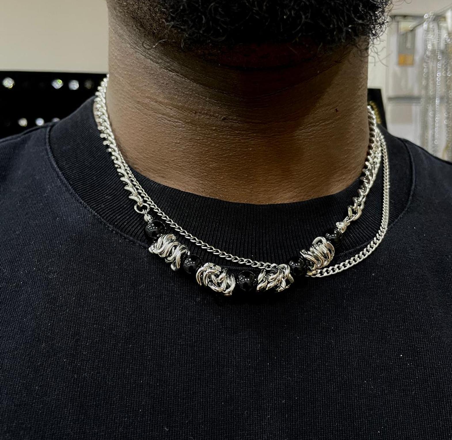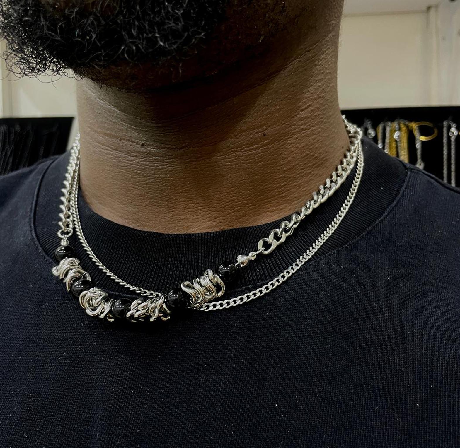 This bold dual-layer necklace combines sleek Cuban chain links with eye-catching decorative metal beads for a contemporary urban style. The layered design creates depth and dimension, making it perfect for those who want to make a statement.