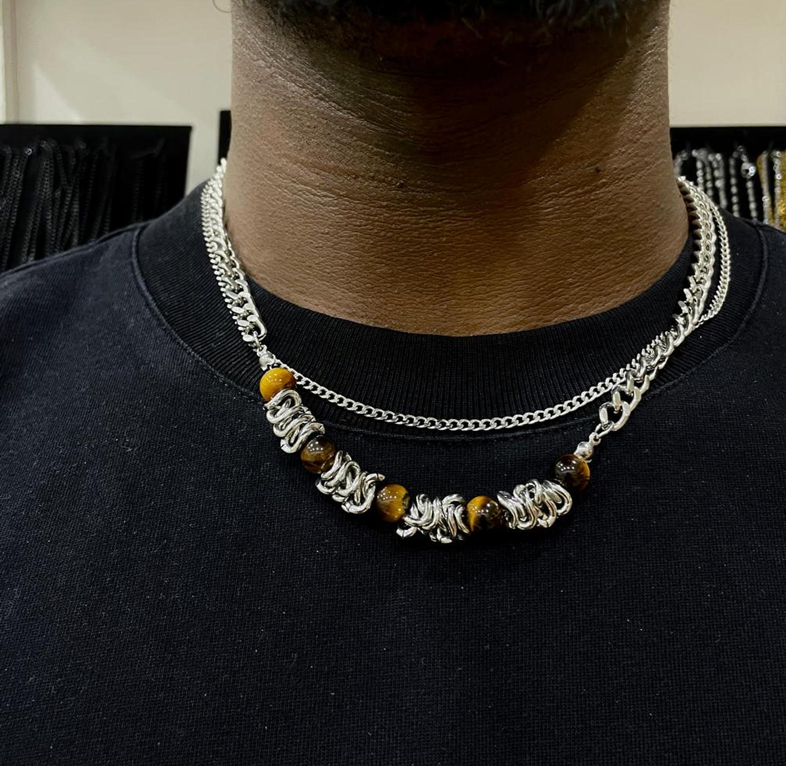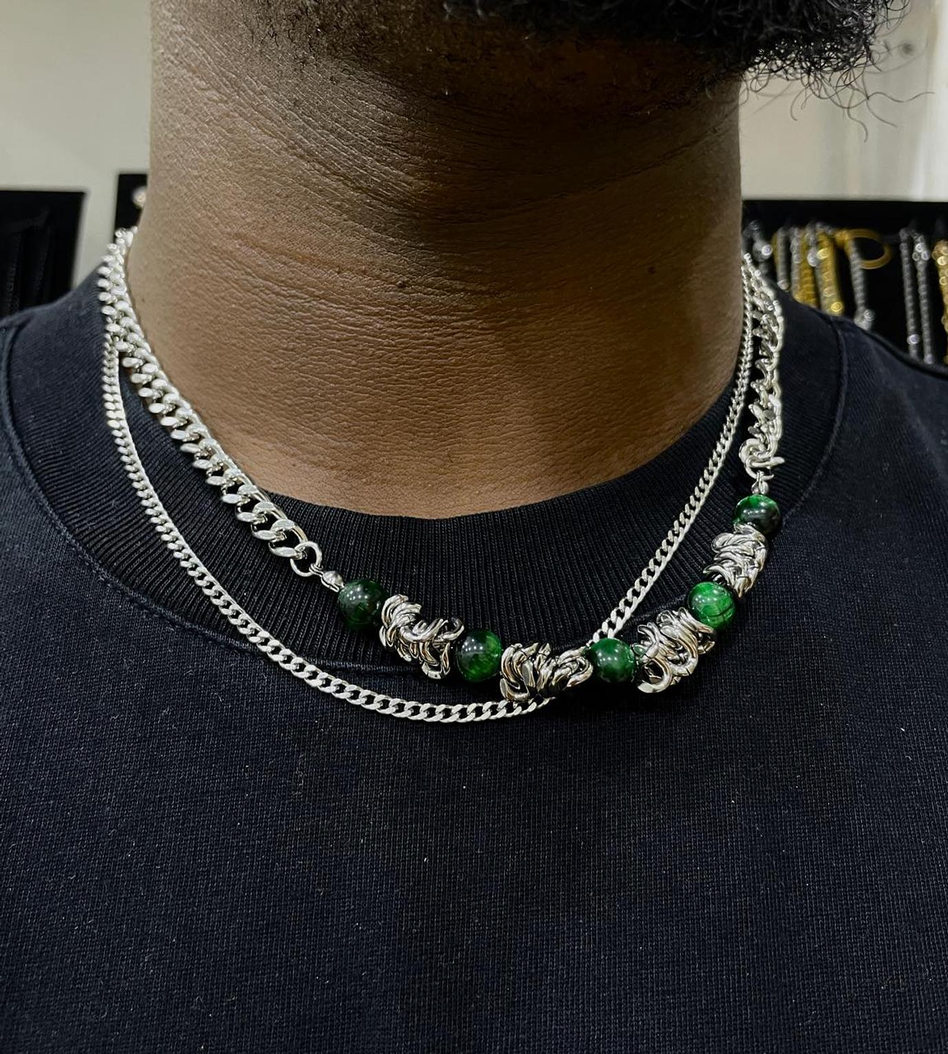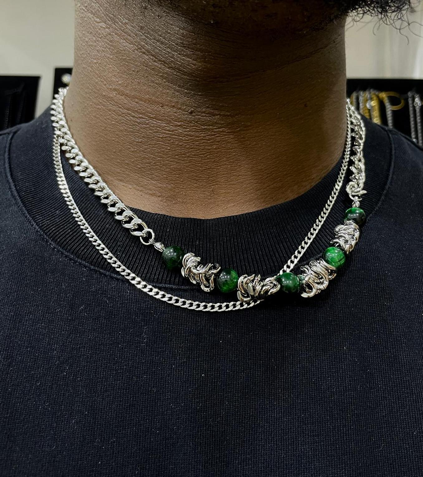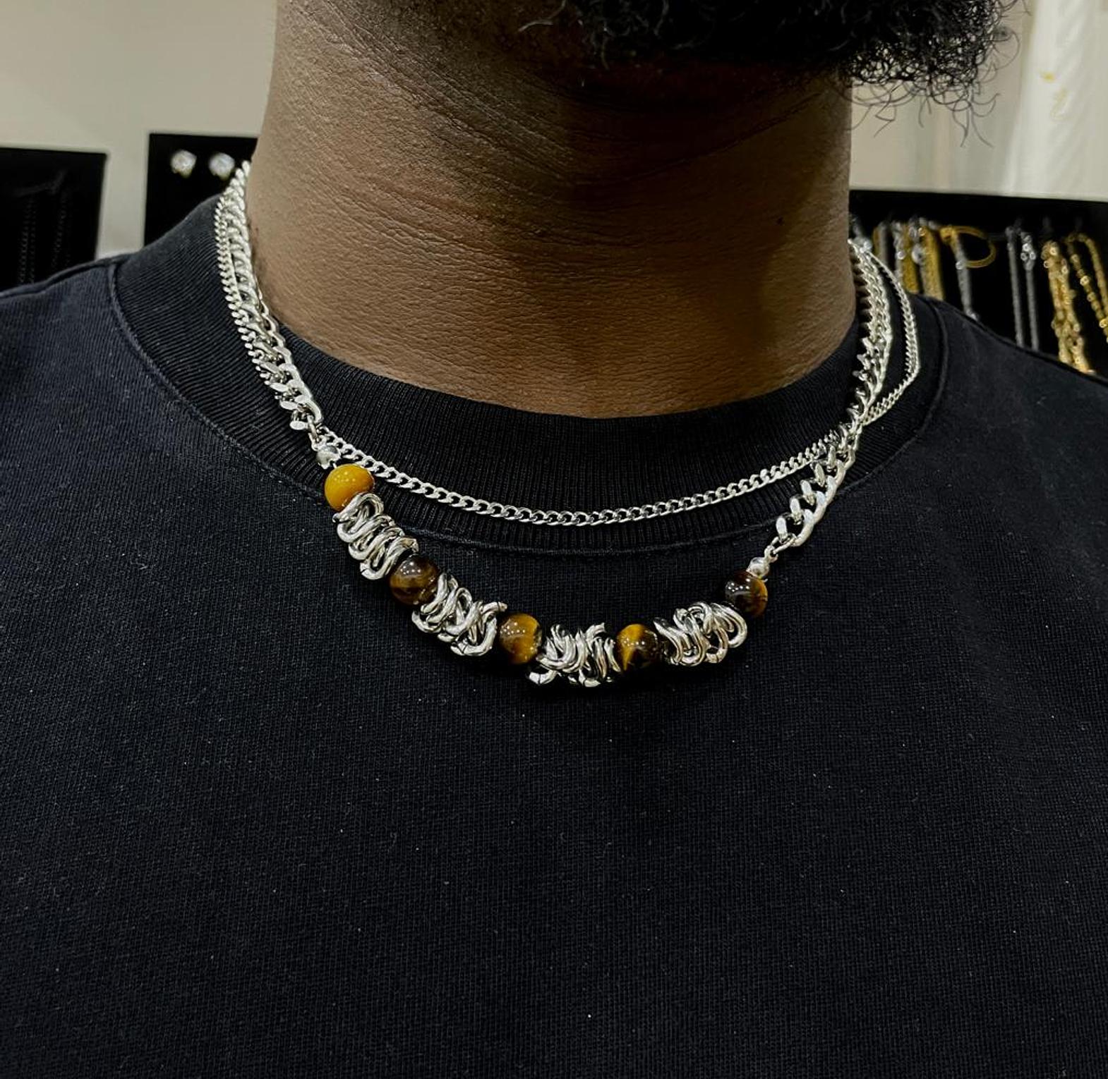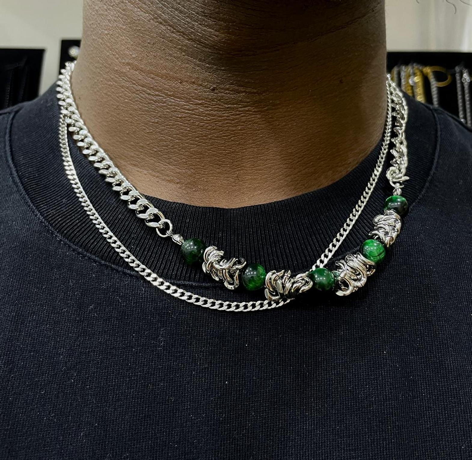 This bold dual-layer necklace combines sleek Cuban chain links with eye-catching decorative metal beads for a contemporary urban style. The layered design creates depth and dimension, making it perfect for those who want to make a statement.