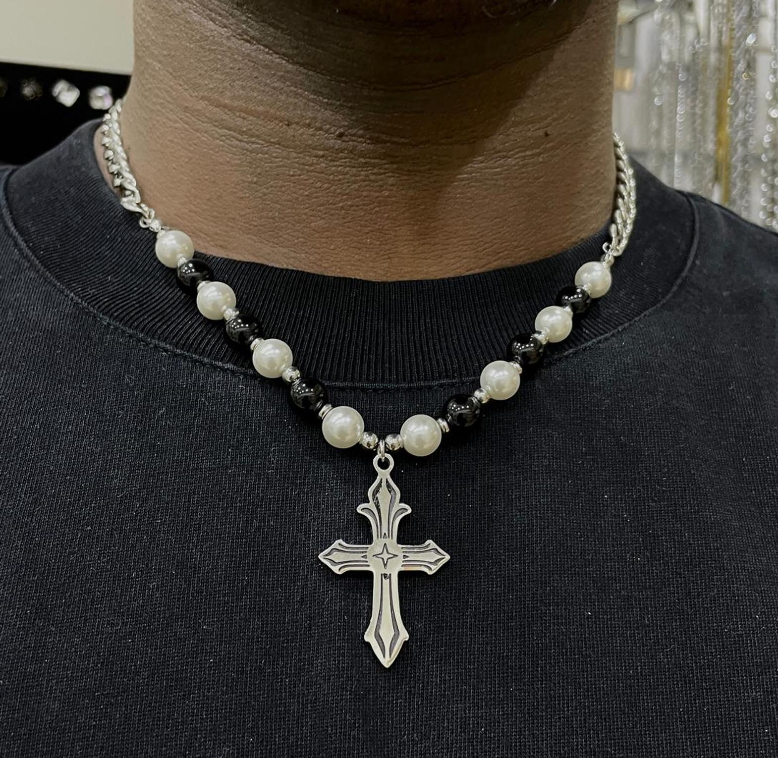 Unleash a bold statement with the Onyx & Pearl Cross Chain, featuring an alternating pattern of dark onyx and luminous pearls. This eye-catching piece culminates in a striking cross pendant, blending contrasting elements for a powerful look.