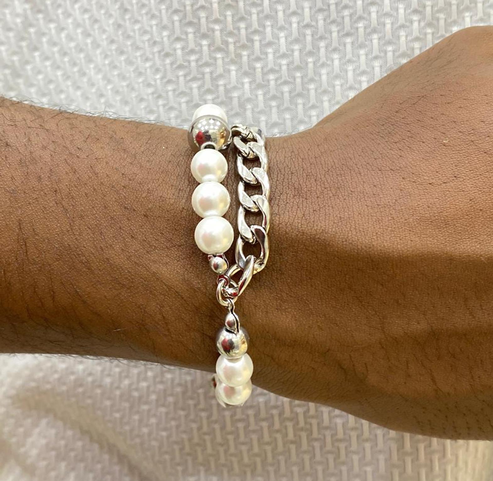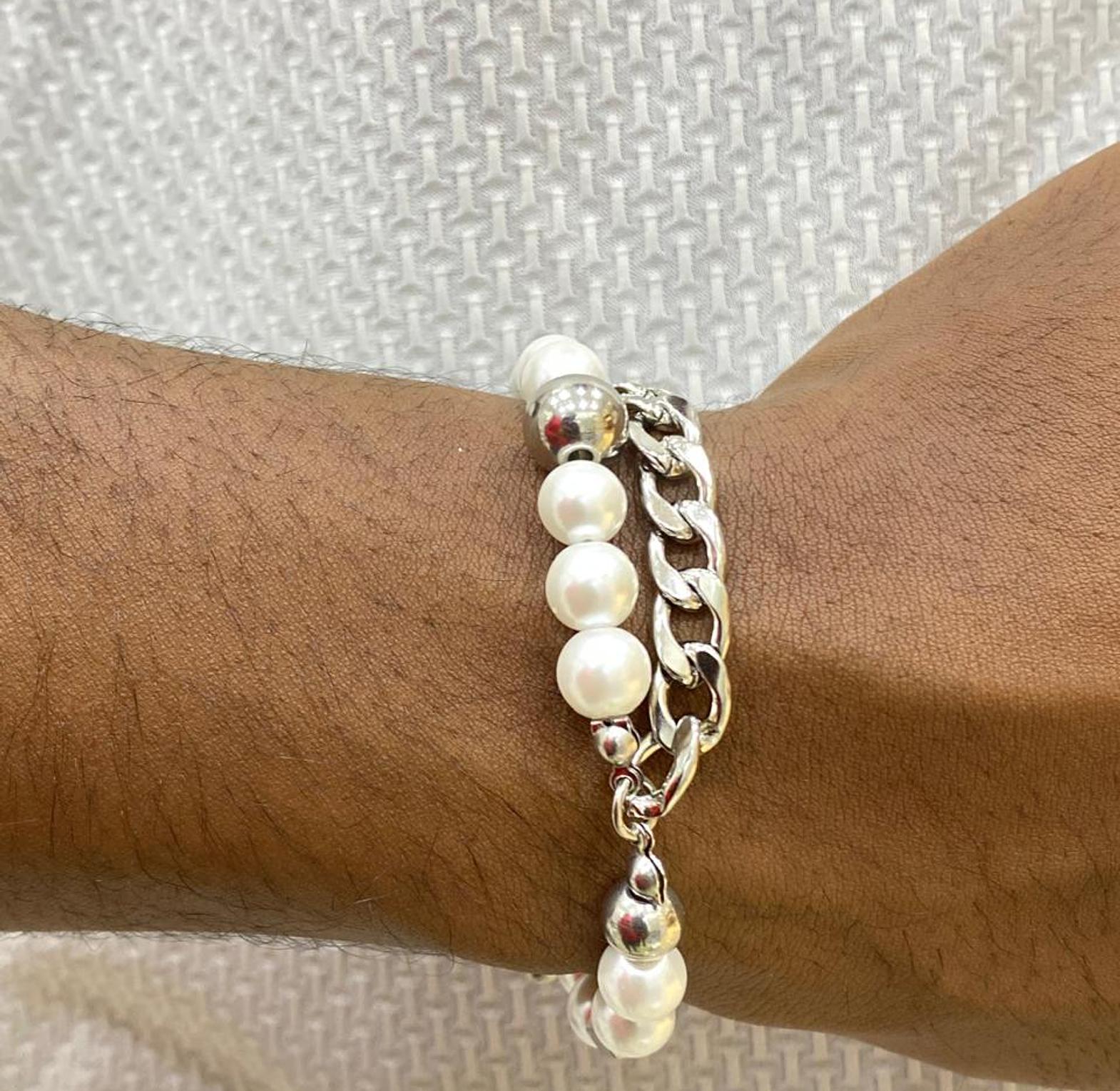 Embrace a sophisticated blend of classic elegance and modern edge with the Pearl & Chain Fusion Bracelet. This unique piece combines lustrous pearls with a bold silver-tone chain for a captivating wrist statement.