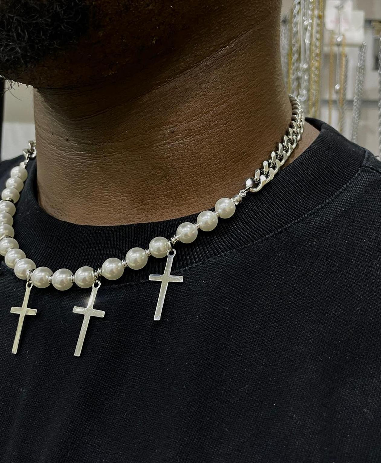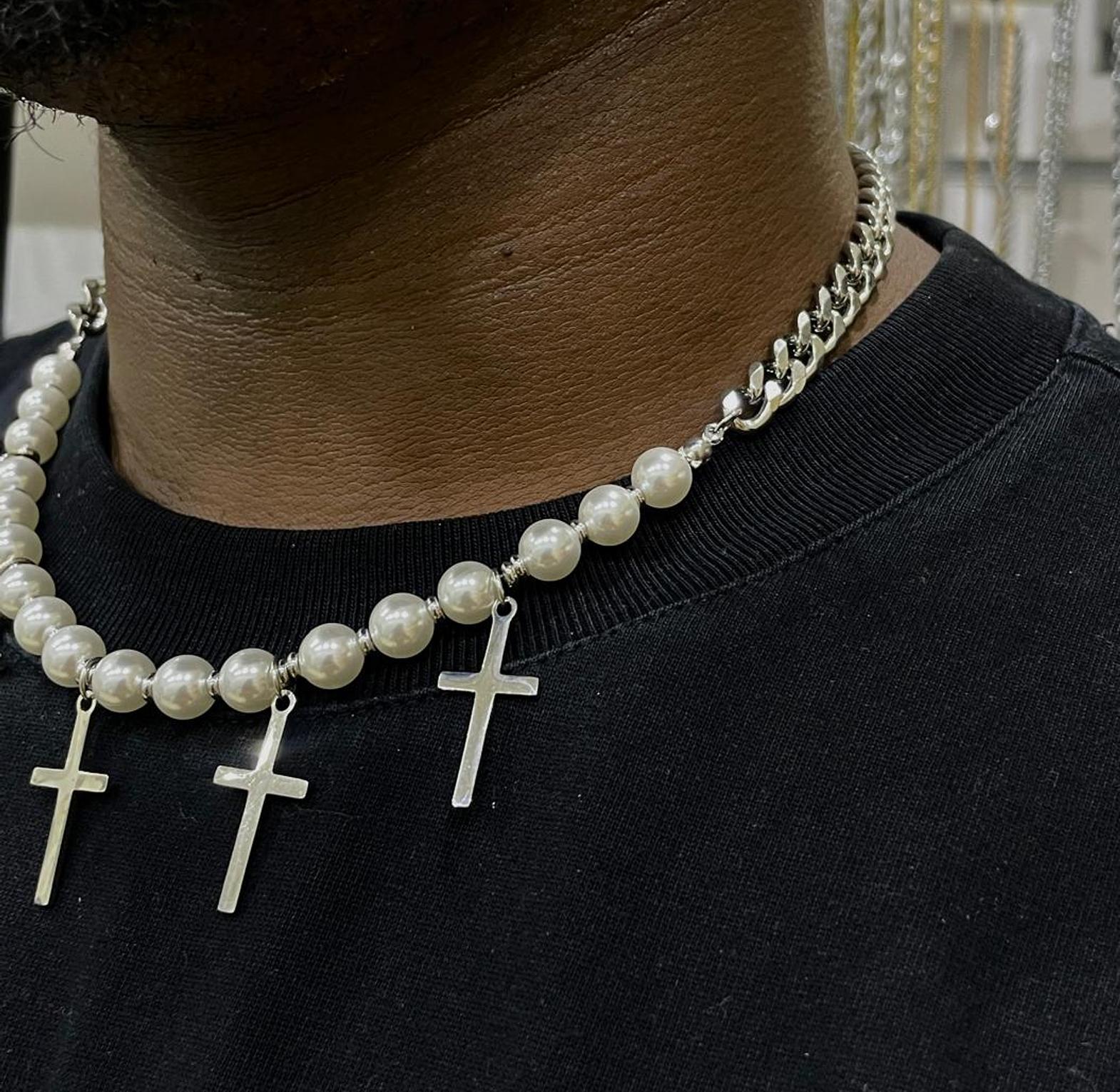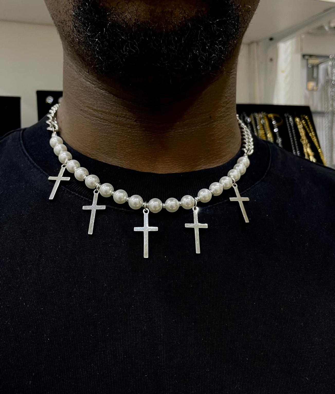 Elegantly blending classic pearls with modern crosses, the Pearl & Cross Necklace offers a unique statement of faith and style. This captivating piece adds a distinguished touch to any ensemble