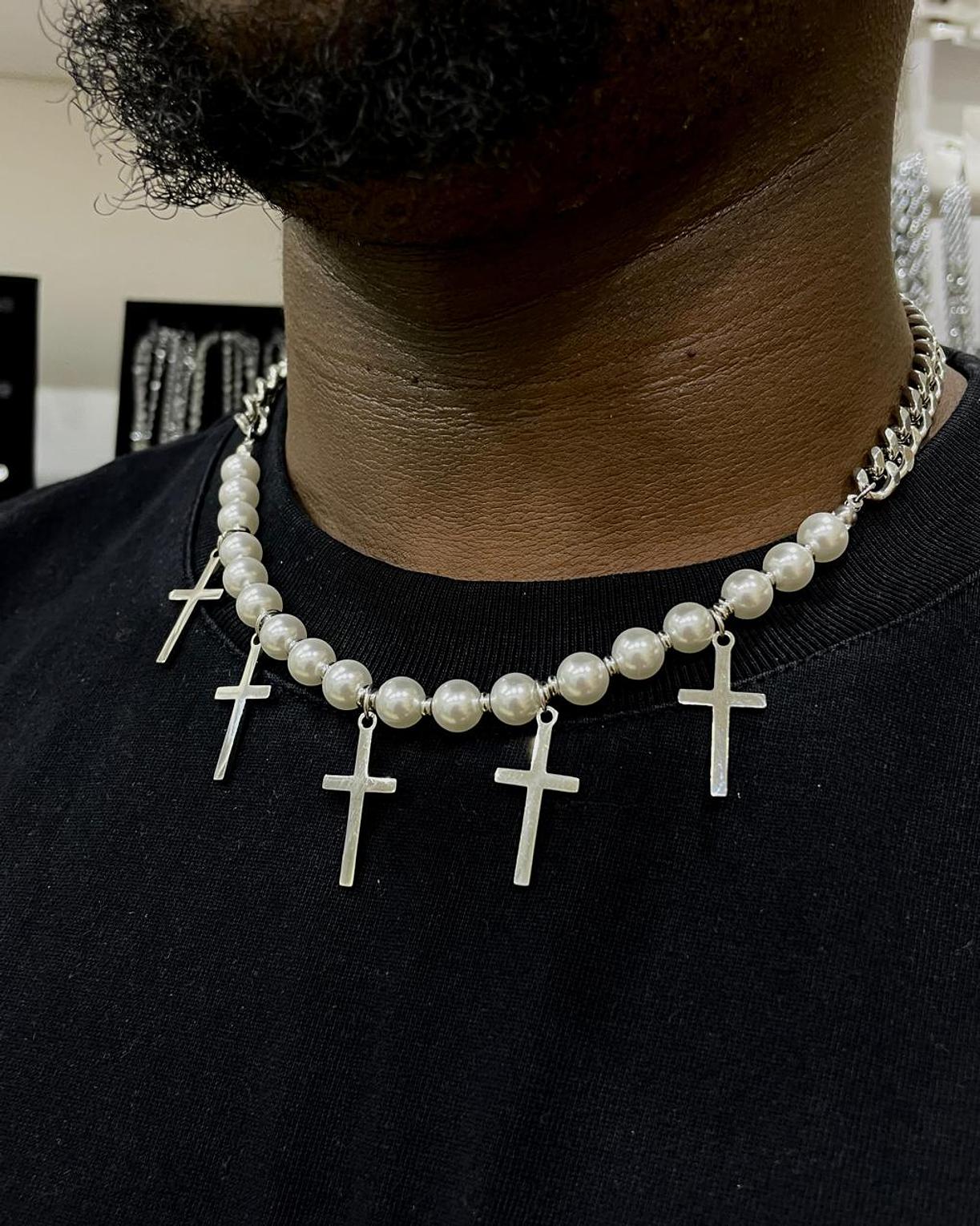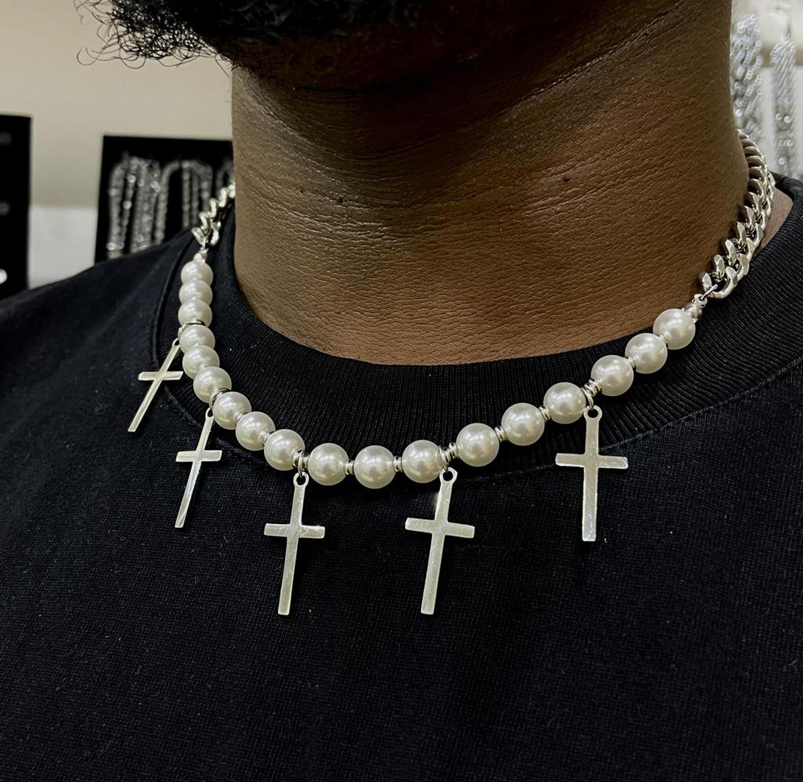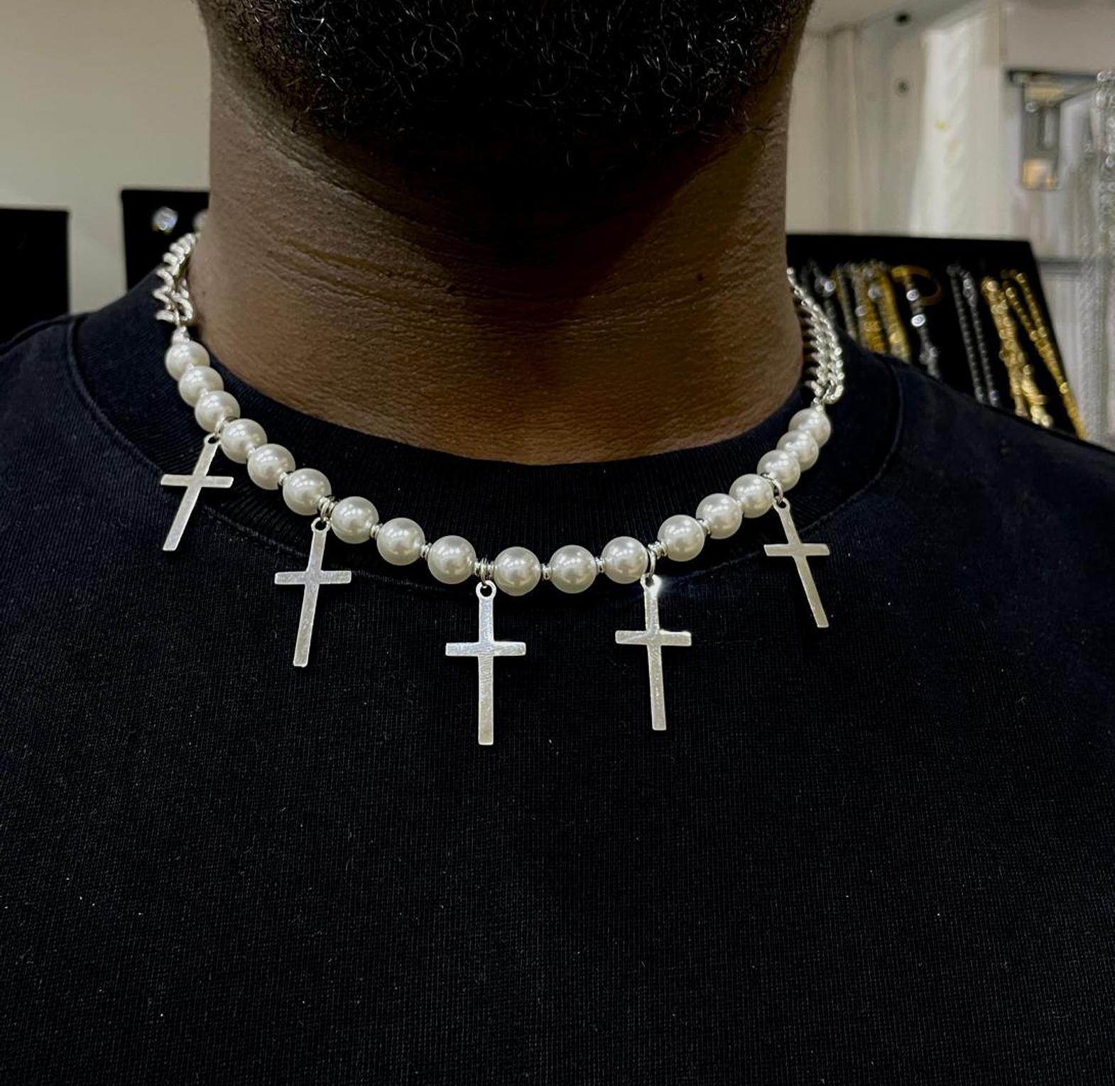Elegantly blending classic pearls with modern crosses, the Pearl & Cross Necklace offers a unique statement of faith and style. This captivating piece adds a distinguished touch to any ensemble