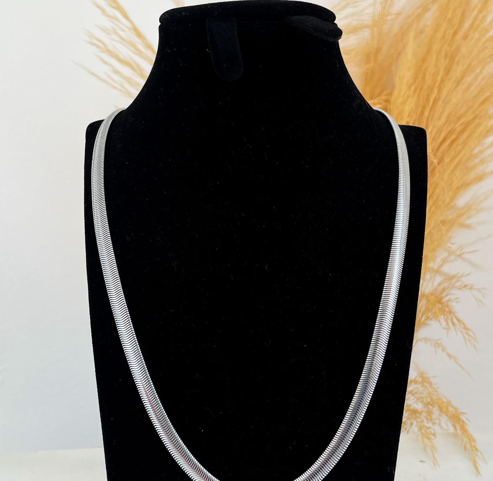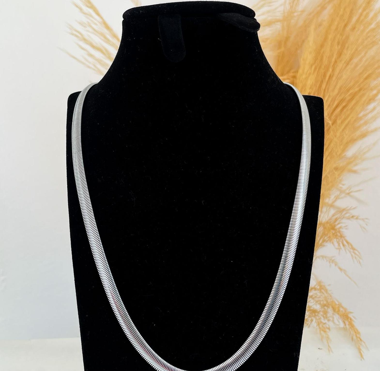 Experience a sleek and modern look with this stunning snake chain. Its smooth, flexible design drapes elegantly, creating a sophisticated liquid-metal effect that catches the light beautifully.