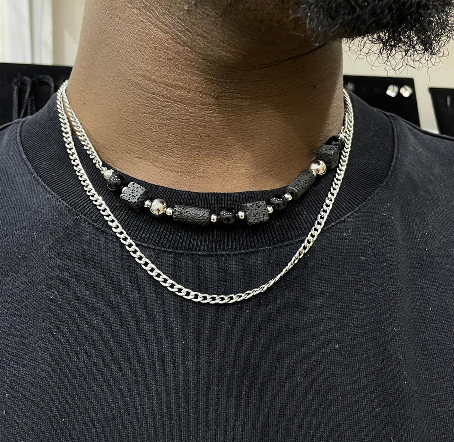 Embrace a fusion of raw texture and sleek shine with the Volcanic Edge Layered Chain, featuring natural black lava beads paired with a classic chain. This duo offers a modern, rugged elegance for any look.
